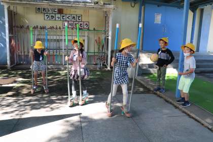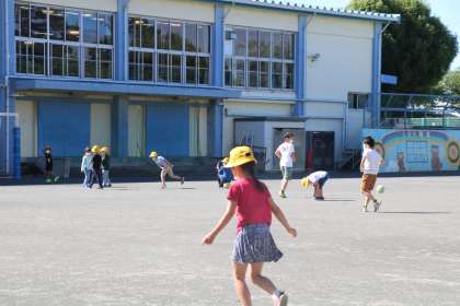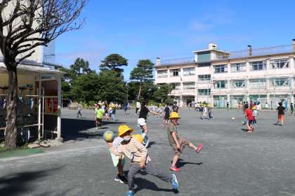 校庭の土がぬかるんでいるところを上手によけながら、遊んでいます。