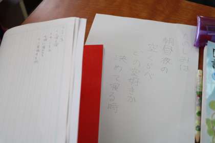 国語「楽しみは」の学習で、ある歌人の作った短歌を学習した後、子どもたちも短歌づくりに挑戦しています。友達同士こっちのほうがいいとか、もっとこうすればいいとか、感想を言い合うことでさらに練って作品を作っています。