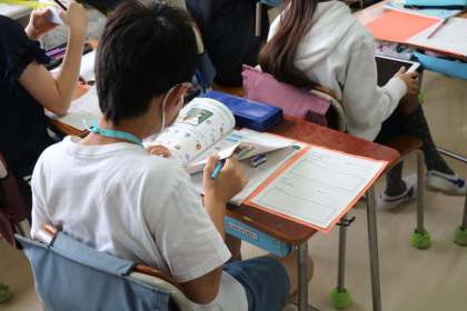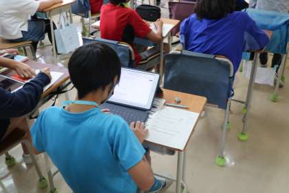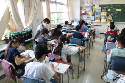 6年生の外国語の授業です。今日は、日本の伝統行事紹介のスピーチメモを作っていました。タブレットや本を使って雛祭りや盆踊りなどの伝統行事を調べて英語のメモにまとめていました。