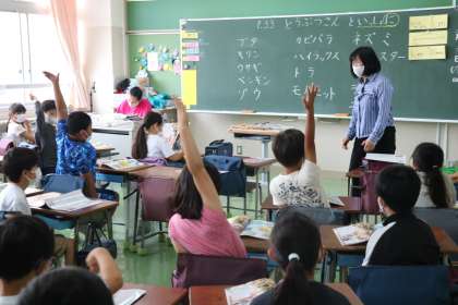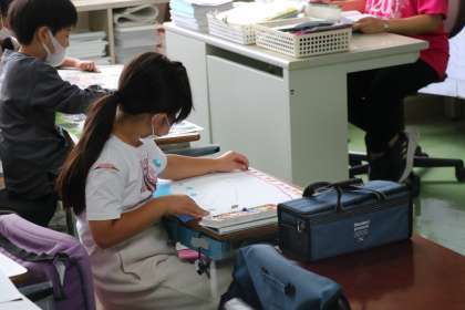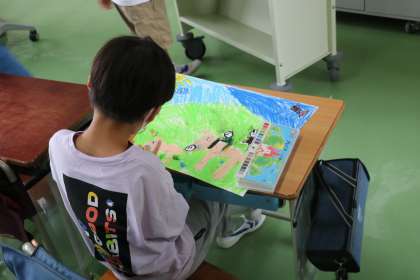 2年生の図工の授業です。「どうぶつさんといっしょに」というテーマで絵を描いていいました。事前にどんな動物にするかなどみんなでじっくりと考えてから描き始めていました。