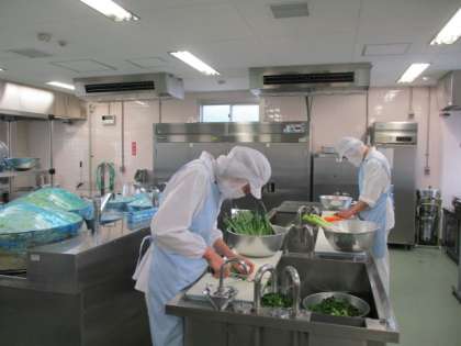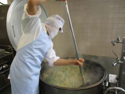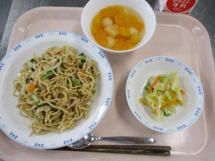 塩やきそばに使う麺の量は全部で54キロあります。給食室の大きな釜でも1回では炒められないので、3回にわけて炒めています。ソース焼きそばも人気ですが、塩焼きそばもこどもたちにとても人気がある献立です。