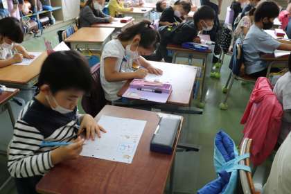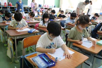今日のひらがなは「お」です。最後の、結んで・ふくらんで・はらうところが難しいです。子どもたちは一生懸命です。