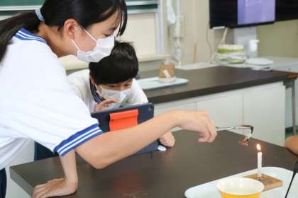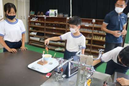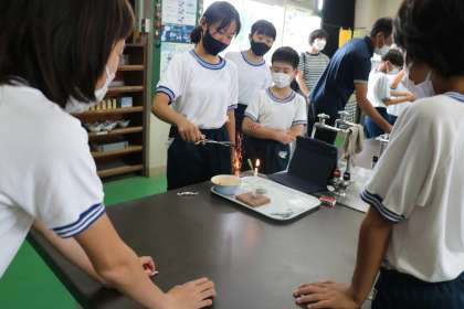 燃焼実験は、花火のような炎が見られ、子どもたちは大喜びです。