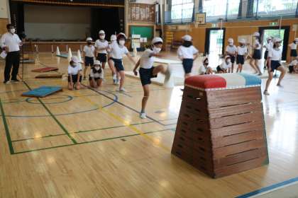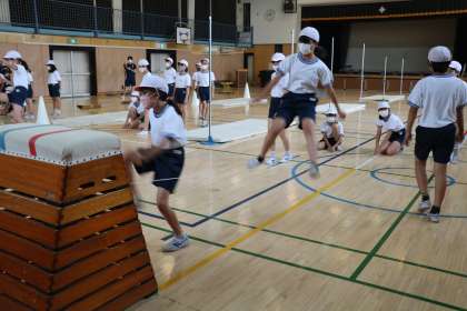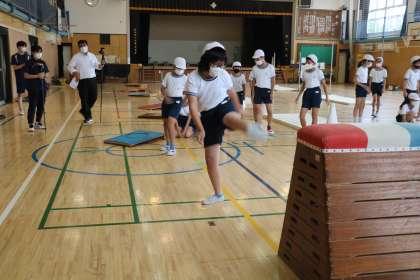 6年生体育「走り高跳」の学習の様子です。まずはゴムとびで足の上げ方、踏み切る位置を確かめます。