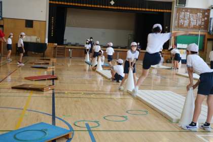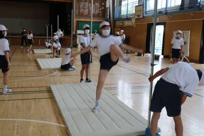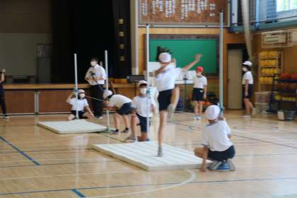 跳ぶ様子を見ている先生は、たくさん声をかけてくれます。足の上げ方がいいよ、足の裏が見えるのいい跳び方だよ、踏み切るまでのリズムがいいね、手も使っていることもいいよ、など。先生に価値づけられるとまた次への意欲につながります。周りの友達も『なるほど、そこがコツなんだ』と自分が跳ぶときも意識できます。みんなで学びあっているとても良い雰囲気です。