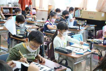 「日」という漢字のコツをしっかり聞きながら黒板と先生の話に集中します。先生が書く手本に、思わず「じょうず〜」と拍手を送る子どもたちが可愛いです。