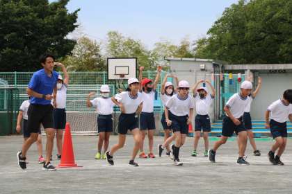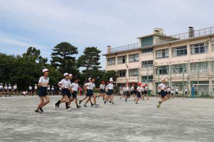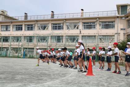 6年生学年体育の様子です。シャトルランを走っています。走っている子にわかりやすいように記録する子や見ている子たちは応援の声をかけます。子どもたちを励ましながら、いつの間にか先生も参加。よく頑張りました!