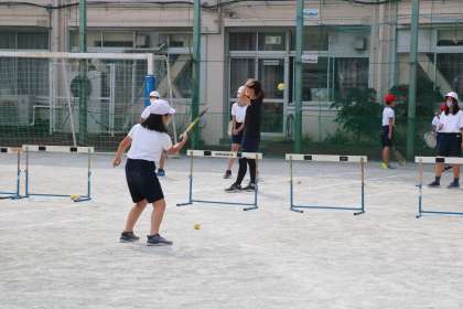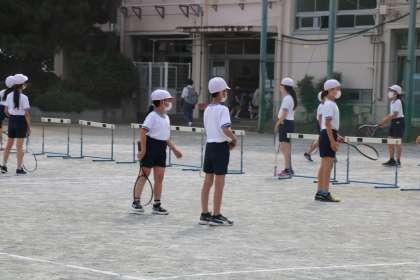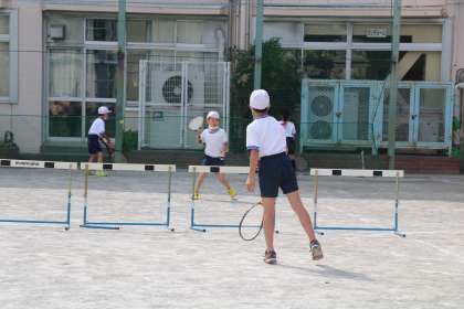今日は久しぶりのクラブ活動です。写真はテニスクラブの様子です。ハードルはネットの代わりです。