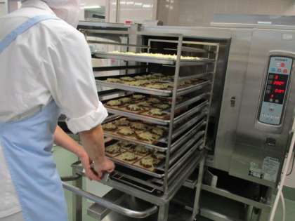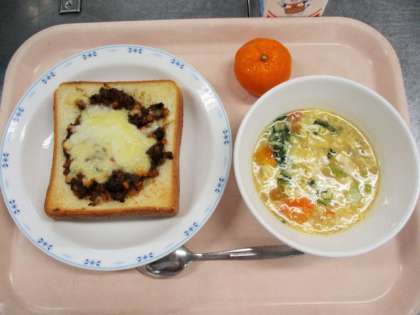 ドライカレーチーズトーストは鶏レバーとレンズ豆を入れることで、鉄分が多くとれるよう工夫して作っています。鉄分は不足しがちな栄養素です。給食では1日の必要量の1/3以上がとれるように献立をたてています。写真はスープにいれるトマトの皮をむいているところと、トーストをオーブンで焼いている様子です。