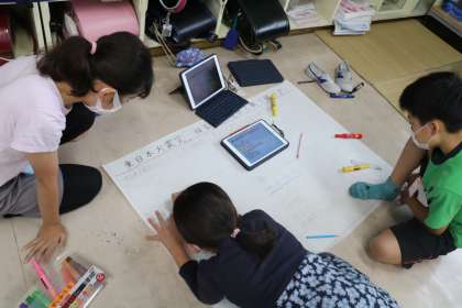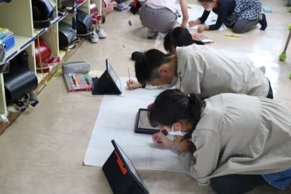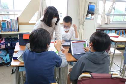 6年生社会課題について調べ発表する学習の様子です。課題は2つ。「震災復興の願いを実現する政治」か「子育て支援の願いを実現する政治」です。