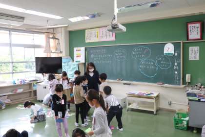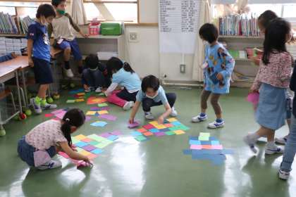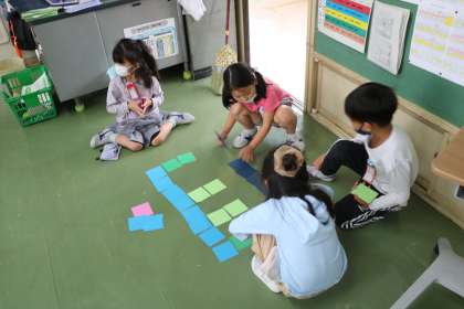1年生の図工の授業です。友達と協力して色カードを並べて「いいかんじ」の形を作っていました。形カードのや色に注目して、いろいろな作品ができていました。