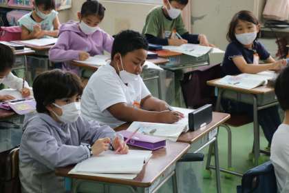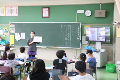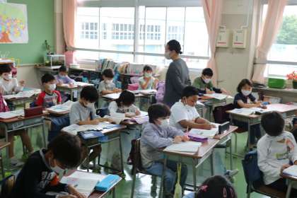 2年生の国語の授業です。スイミーが大きな魚を追い出した場面を読み深めていました。最後に、大きな魚を追い出したスイミーに手紙を書いていました。子供たちは、物語を読み進めるにつれて、スイミーへの思いが大きくなっているようです。