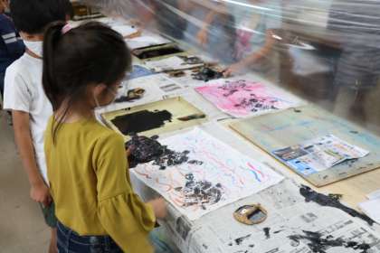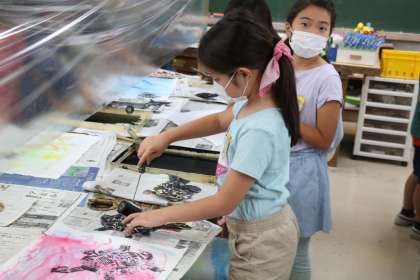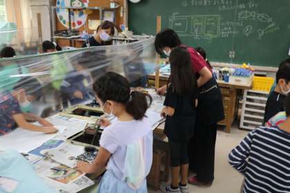 3年生の図工の授業です。版画の作品の仕上げを行っていました。黒インクをつけた版を自分で考えた位置において、ばれんで丁寧にこすって絵を完成させていました。きれいに色を出すのがとても難しそうでした。
