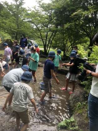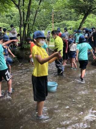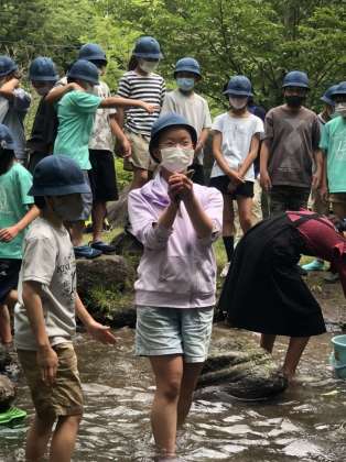 はじめ水の冷たさにびっくりしながらも、マスつかみに夢中です。
