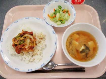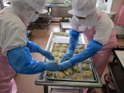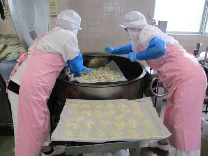 かきあげはひとつひとつ給食室で手作りしました。大豆、枝豆、ちりめんじゃこ、さつまいも、たまねぎ、にんじんとたくさんの豆や野菜が入ったかきあげです。上から、鰹節からとっただしで作ったてんつゆをかけて食べます。