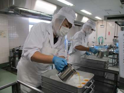 写真はゼリーをカップに注ぎ分けているところと、五目うま煮のごぼうを乱切りにしているところです。