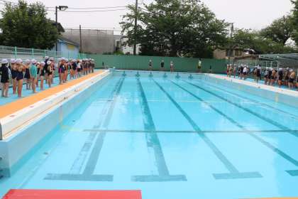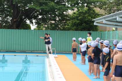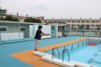 2年生のプール開きの様子です。同じく、安全に楽しく水泳学習ができるようにお清めをしました。