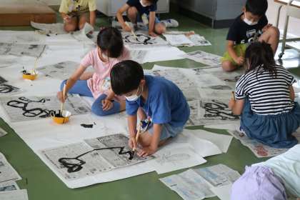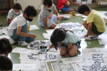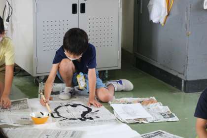 1年生の図工の授業です。今日はやごの絵を新聞紙に大きく描いていました。手本をよく見て筆を大胆に使って描いていました。