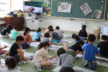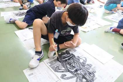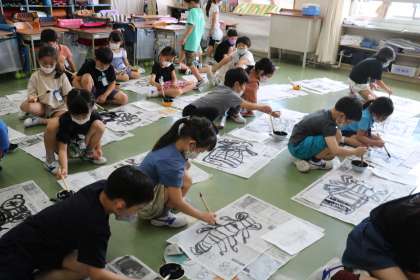 1年生図工の様子です。新聞紙にヤゴを描いています。