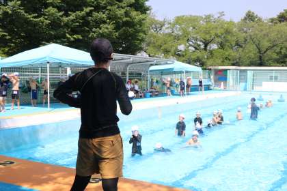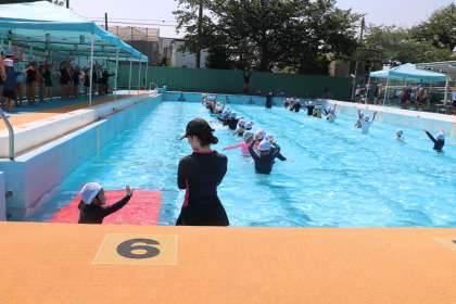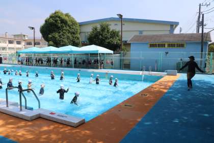 1年生水泳学習の様子です。運動会で踊ったダンスで水慣れです。羽をはばたかせるところでたくさん水をかけます。