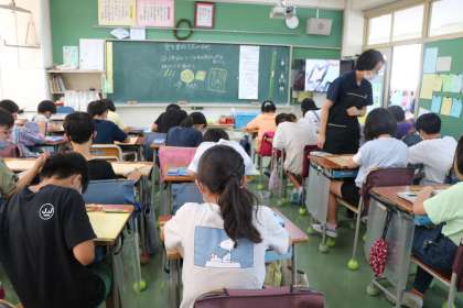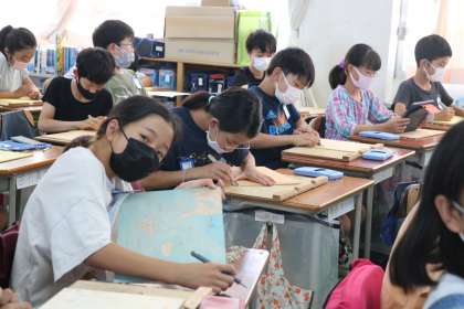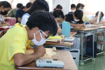 5年生図工「彫って表す色と形」の様子です。彫り進み版画の仕組みを理解し1回目のインクの色を残したいところを彫っています。
