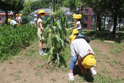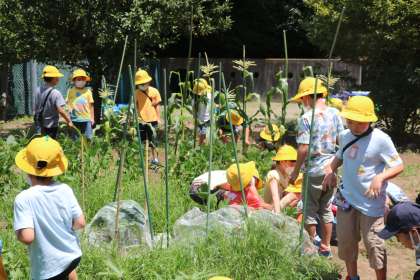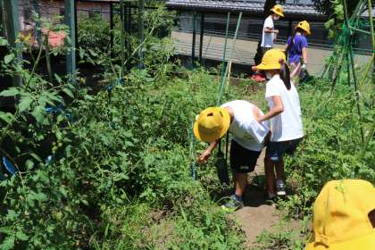 「ミニトマトだけど葉っぱや茎はミニじゃない!僕の背より高くなっているんだよ。」といろいろな発見がある子どもたちです。