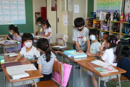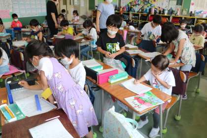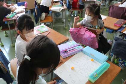 算数「引き算ゲーム」をやっています。紙の上でブロックをおはじきのように飛ばし、大きい数から小さい数を引きます。隣のお友達といっしょにやりながら、知らないうちにたくさん引き算の問題をやっています。