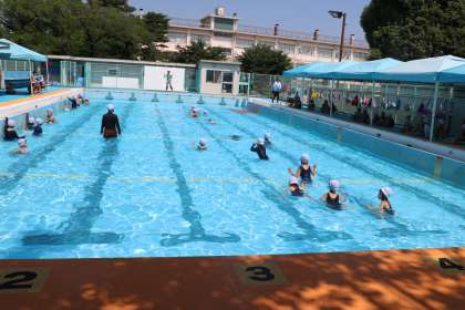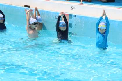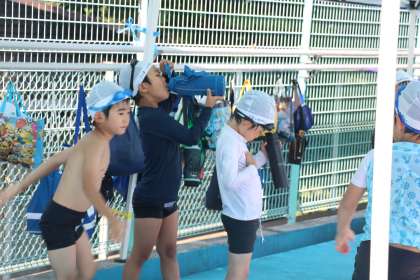 ロケットのようにシュッと伸びたり、水中に顔を半分までつけてカニ歩きをしたり、いろいろな動きをしながら水と仲よしになります。プールから上がったら、水分補給も忘れません。