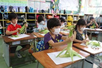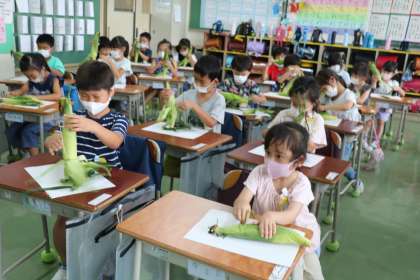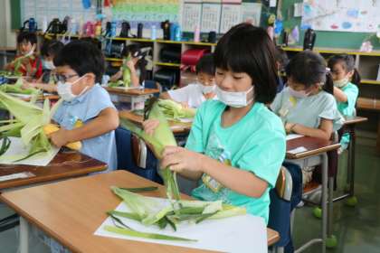 新鮮なトウモロコシなので、ひげの部分がぺたぺたします。子どもたちは最初、おっかなびっくり触っていました。