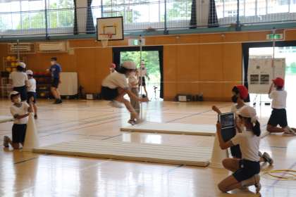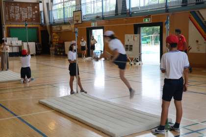 6年生の体育の授業です。体育館で走り高跳びの授業を行っていました。グループごとに分かれてゴムのバーを跳び越える練習をしていました。タブレット端末で跳び方を撮影した動画を確認している場面もありました。いろいろな場面でタブレット端末が活用されています。
