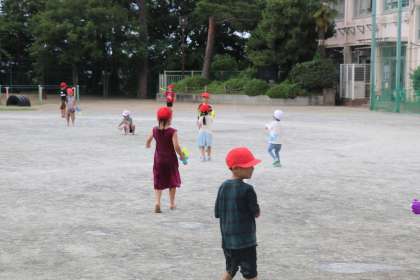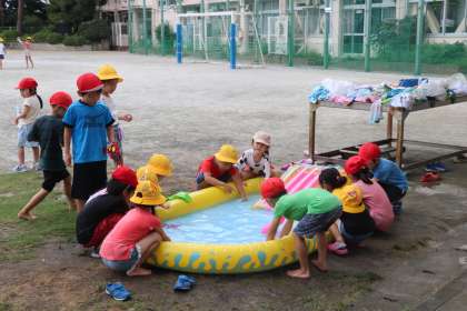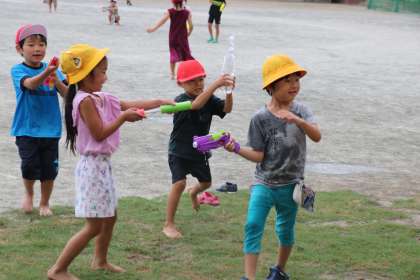 校庭では、1年生が水遊びをしていました。水鉄砲やペットボトルなどに水を入れて友達い同士楽しく遊んでいました。みんな全身ずぶ濡れでした。