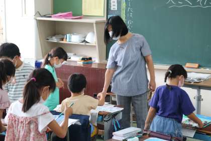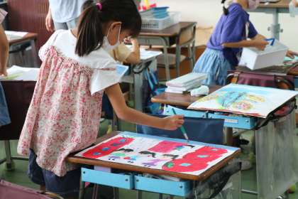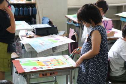 2年生の図工の授業です。「大きくそだて びっくりやさい」という作品を作っていました。どの子も大きな野菜の絵ををモチーフに個性的な作品になっていました。絵具とクレパスを上手に使い分けていました。