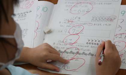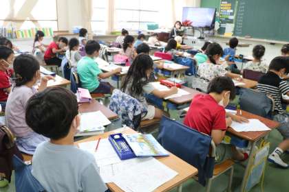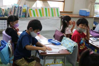 1年生算数・1学期のまとめ学習の様子です。プリントを使って一生懸命取り組んでいます。