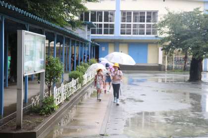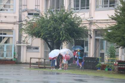 雨の降る登校時間です。8時5分のチャイムになるべく近い時間の登校にご協力いただきありがとうございます。密にならずに昇降口に入れます。