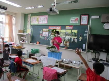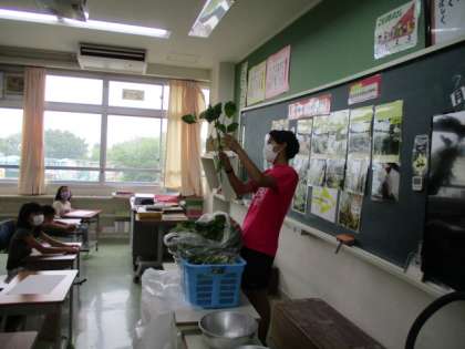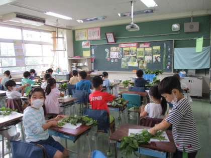 今日は2年生が生活科の学習の一環で枝豆のさやもぎをしました。夏野菜をたくさん育てている2年生です。野菜の花には大分詳しくなりました。今日の枝豆は、八百屋さんで買ったもので、給食に出ます。