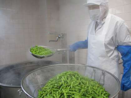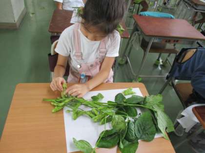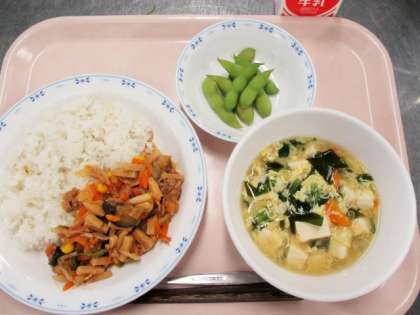 今日の枝豆は、1時間目に2年生がさやもぎをしてくれた枝豆をすぐに給食室でゆでたものです。さやもぎの説明の時に、えだまめの花あてクイズをしたところ、ほとんどの児童が正解できました。2年生は枝豆を小学校の畑で育てているからでしょうか。さやもぎも、全校分を愛情こめて、とても丁寧にもいでくれました。とてもおいしい枝豆でした。