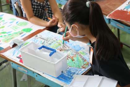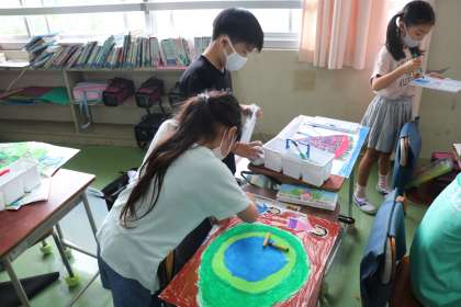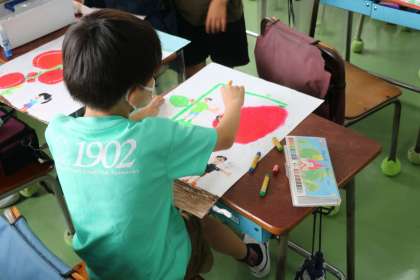 2年生の図工の授業です。「おおきくそだて びっくりやさい」の仕上げをしていました。写真を撮りに教室に行くと、絵をみせてくれて、何を描いたか教えてくれる子がたくさんいました。みんな上手に描けてうれしそうでした。