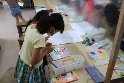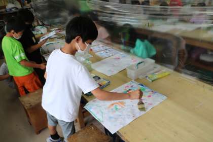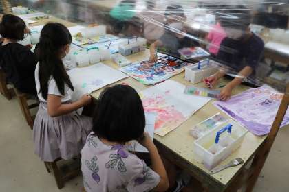 3年生の図工の授業です。「色を重ねて 広がる形」の作品作りを行っていました。絵具と水で色をぼかす手法を使って仕上げていました。。水と絵具の混ぜ方が難しそうでした。