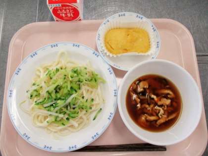 見た目も涼しい夏の給食です。チーズ入り蒸しパンは新メニューです。