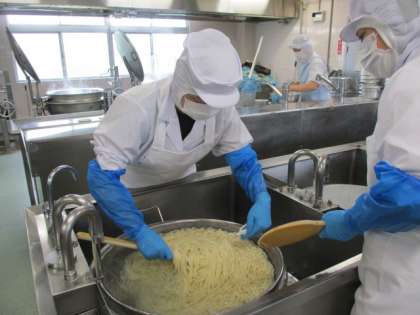 五目冷やしうどんは、うどんをゆでた後、水を何回もかえて、冷やして提供しています。