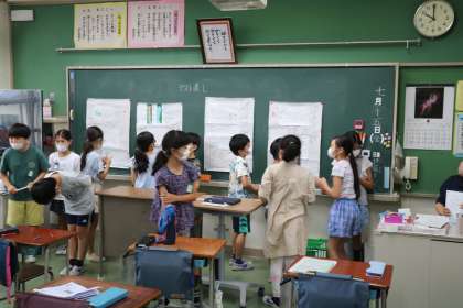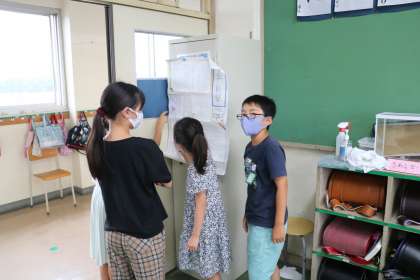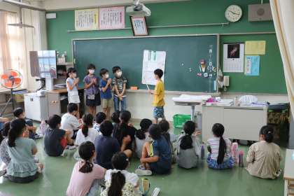 4年生がグループで作った新聞の発表会を行っていました。それぞれのグループで最終チェックの練習の後、発表本番になりました。どのグループも練習の成果が出せたようです。