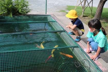 子どもたちの間で「忍者」と名前を付けた鯉がいるのだそうです。珍しく今日は水面近くに上がってきているとか。子どもたちに教わることも面白いです。