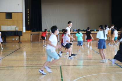 「もういいよ〜」と声がかかり、みんなの輪の中に入ります。鬼の子はみんな同じ動きをしている中から、その動きの震源地の子を探します。上手に動きを変えているようでいて、顔に出てしまうところがまだまだ2年生。可愛いです。