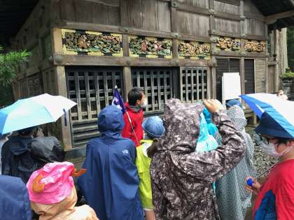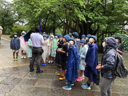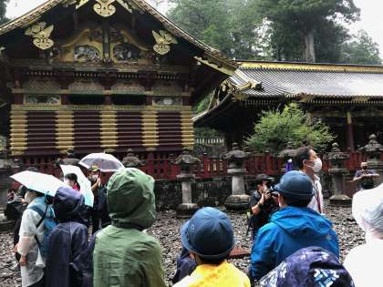 SLが日光駅につく頃突然の雷雨に遭いました。雨具を持って日光東照宮を回りました。ガイドの方の話を真剣に聞く子どもたちです。