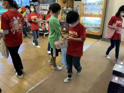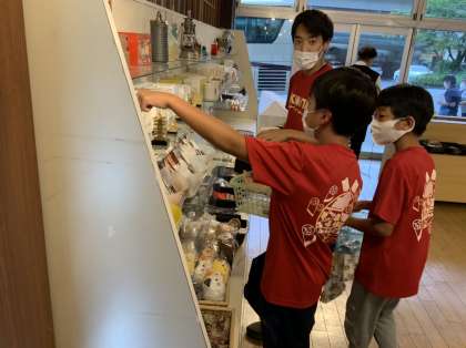 夕食前にお風呂とお土産購入タイムです。子どもたちは計算機とカゴを片手に、お土産を渡す相手を想い選んでいます。