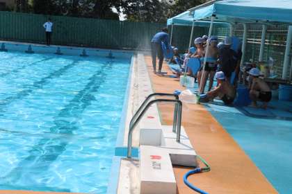 途中、水分補給をしっかりします。プールサイドにはテントが張ってあり全員日影の中で体を休めたり、プールサイドのミストシャワーで涼んだりできます。