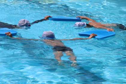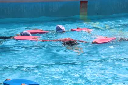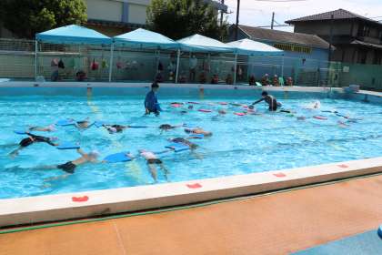 ビート板を使って模様を作ります。2人、4人、8人・・と友達と一緒に楽しみながら活動するうちに、体の力を抜いて浮くこと、3秒、5秒と息を調節して顔をつけることの練習になり、次の「泳ぐ」ことに繋がります。1・2年生は、たくさん水と仲よしになってほしいです。