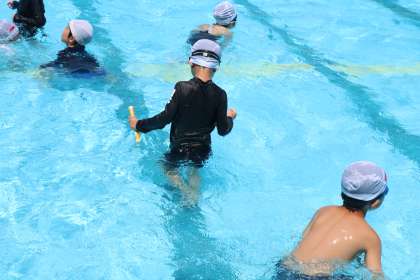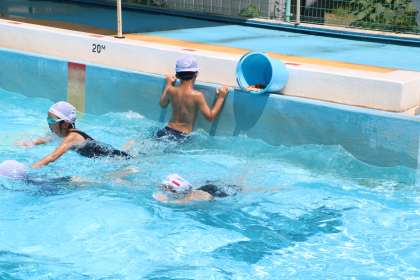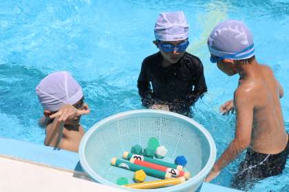 宝はいろいろな形があります。ただし、プールの底に沈んでいるのでもぐって取らなければなりません。みんな頑張っています。