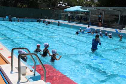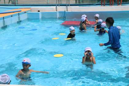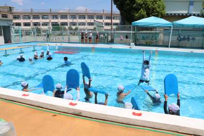 ビート板を使っているグループもあります。丸い浮き具は両面色が違うので自分のチームの色に変えていきます。水中を歩くのも、力強くしっかり歩けるようになりました。