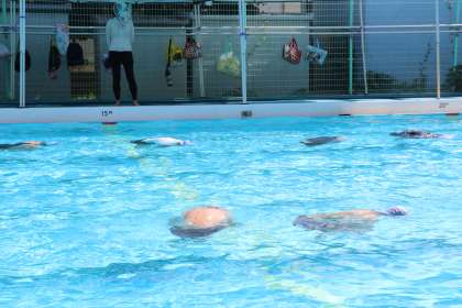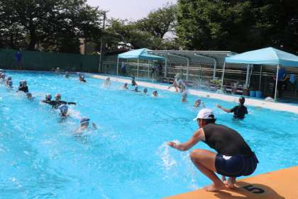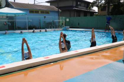 水慣れを十分やった後は、自分の泳ぎを確かめながら25メートルを泳ぎます。